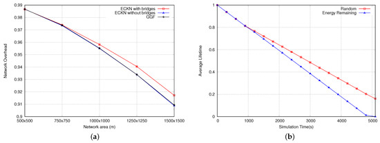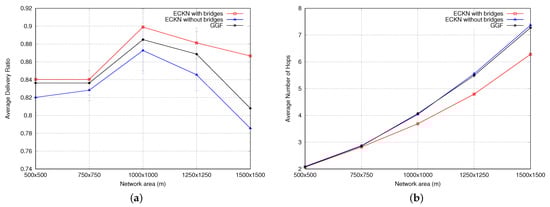 Figure 14a, ECKN with bridges outperforms ECKN without bridges and GGF. This is because ECKN creates bridges that shorten the distance between the source node and the sink, increasing the probability of delivering a packet. GGF performs better than ECKN without bridges because ECKN considers not only the positions of the nodes but also their remaining energy, which may cause the packet to take a longer path and increase the probability of dropping the packet. It is also important to note that the 1000 × 1000 m