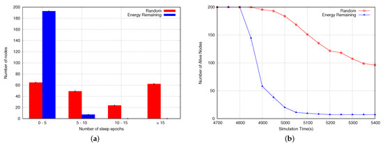 Figure 16a shows the number of sleep epochs in which the sensor nodes go to sleep. Results only emphasize what we have mentioned earlier, most of the nodes are sleeping only in 0 to 5 epochs when using the energy remaining as rank. When using random numbers as rank, we have more than 60 nodes having more than 15 epochs where they are sleeping, explaining the better lifetime when using this approach as rank.