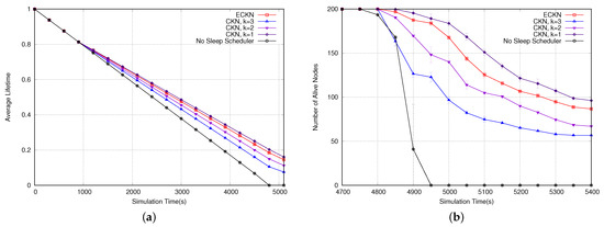 In this section, we evaluate the impact of our proposed sleep scheduler on the network lifetime. Firstly, we assess the impact of using the residual energy of the node instead of a random number as a rank in the CKN algorithm. We also evaluate our ECKN algorithm, which has different values of k depending on the node’s distance from the sink: for nodes close to the sink, for nodes in an intermediate region, and for nodes further from the sink. We compare our algorithm with the solution that has no sleep scheduler and with CKN having , , and .