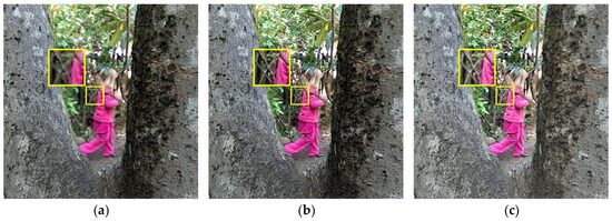 In Figure 9, we can see that the fusion images obtained by the BGSC, FusionDN, and PMGI approaches exhibit a certain degree of the blurring phenomenon, which makes it difficult to observe the information in the images, the image generated by the BGSC method especially not achieving full focus and the information on the left side of the image being severely lost; the NSCT, TEMST, and ZMFF methods all obtain a basic fully focused image from which information about the entire scene can be observed; the GD method gives a high-brightness fusion image but can also cause some details in the image to be lost; the fused image achieved by the U2Fusion method has many darker areas, causing severe information loss (for example, the information about the girl’s clothing and headscarf in the image cannot be captured correctly); the fusion image obtained by our algorithm fully preserves the information of the two source images. Additionally, it not only has moderate brightness, but the detailed information of the entire scene can also be fully observed and obtained.