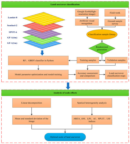 The flow chart in Figure 2 shows the mapping and analysis methods applied in this study. Land use/cover classification and analysis of scale effects are the main steps involved. The following sections describe the analysis scheme and several relevant steps in this study in detail.