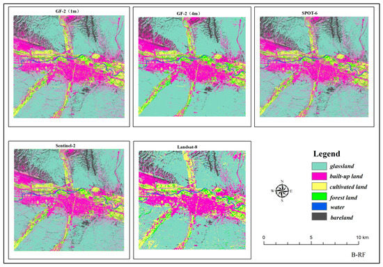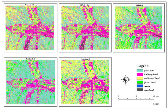 In our study, the classification input features are 1 m and 4 m for GF-2, 6 m for SPOT-6, 10 m for Sentinel-2, and 30 m for Landsat-8 in the red, green, blue, and near-infrared bands, respectively. The classification samples are actual land cover type samples acquired by handheld GPS in the field, of which 80% are training samples, and 20% are validation samples. The classification parameters are set the same for different resolutions in the same classification method. In order to reduce the influence of other factors, the scale effects of the classification results are explored with the same inputs, the same samples, and the same parameter settings.