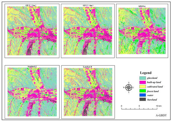 RF and GBDT are the most popular bagging and boosting ensemble methods based on decision trees. In our study, the GBDT model outperforms the RF model due to the different ensemble of trees in the ensemble methods. RF uses bagging (bootstrap resampling) method to construct different training sets and determines the final classification result using the maximum number of votes for the results of different datasets. GBDT uses gradient boosting to create a tree based on the residuals of the previously created tree. Both RF and GBDT have advantages, such as dealing with nonlinearities and limiting overfitting. Dietterich [44] compared bagging and boosting ensembles and found that the noise in the boosting dataset is less than that in the bagging dataset, which means that boosting is sensitive to the noise in the data. The signal-to-noise ratios of data at different scales are different, but in this study, RF and GBDT are better in GF-2, SPOT-6, Sentinel-2, and Landsat-8 classifications. The ensemble classifier has complementary advantages over a single classifier and can improve classification accuracy, in accordance with Feng et al. [45].