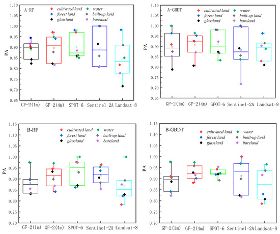 The overall producer’s accuracy of GBDT is higher than that of RF. Among them, the average producer’s accuracy of GF-2 (4 m) in Region A was the highest; the average producer’s accuracy of SPOT-6 and Sentinel-2 was higher in Region B (Figure 5). The producer’s accuracy of water area is generally higher, and the producer’s accuracy of bare land is generally lower. The extreme differences between the maximum and minimum values of the producer’s accuracies of different land cover types on Sentinel-2 are larger, specifically: the extreme differences are larger in Region A than in Region B. This indicates that the distribution of the producer’s accuracies of different land cover types in Region B is more concentrated than that in Region A, and the uncertainties of different feature types in Region A are higher.