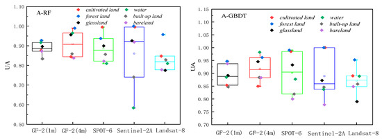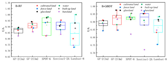 The user’s accuracy of GBDT is generally higher than that of RF. Among them, the average user’s accuracy of GF-2 (4 m) in Region A is the highest; the average user’s accuracy of SPOT-6 and Sentinel-2 is higher in Region B (Figure 6). The user’s accuracy of forest land in Region A is generally higher; the user’s accuracy of unutilized land in Region B is lower. The larger extreme difference between Region A and Region B indicates that the distribution of user accuracy for different land cover types in Region B is more concentrated than that in Region A. The uncertainty of different feature types in Region A is higher.