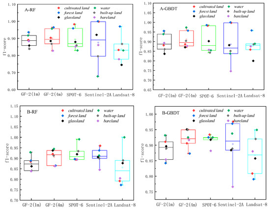 The f1-score is the average of producer accuracy and user accuracy. The average f1-score accuracy of GF-2 (4 m) in Region A is the highest; the average f1-score accuracy of SPOT-6 and Sentinel-2 is higher in Region B; the f1-score of Landsat-8 is lower in both areas (Figure 7). Based on the classification accuracy, it can be concluded that the spatial resolution dependence of the watershed on the image is low, while the dependence on woodland and cropland is high. The accuracy of GF-2 (4 m) is better in Region A, and the accuracy of SPOT-6 and Sentinel-2 is better in Region B. Therefore, the uncertainty of Region A is higher than that of Region B, and the optimal scale accuracy of Region B corresponds to a lower spatial resolution than the optimal scale accuracy of Region A.