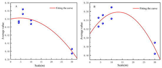 According to the statistical results of regions A and B based on the linear decomposition method, it can be seen that with the decrease in spatial resolution, the mean results of different ground object types decrease, indicating that the decrease in spatial resolution increases the number of mixed pixels, the spatial heterogeneity, and the spatial uncertainty.