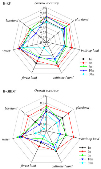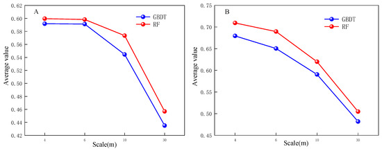 It can be seen from Table 2 that the spatial resolution of the images largely affects the classification results of the images. For the five resolution images included in this study, the overall accuracy exceeds 84.54%. As a whole, the classification accuracy is consistent with related studies [40,41]. The effect of different classification methods on the same spatial resolution is not very significant. The classification accuracy varies by about 6% with a change of spatial resolution from 1–30 m, while the accuracy of different classification methods of the same resolution varies by about 1%, indicating that land cover classification accuracy is closely related to the spatial resolution of remote sensing images. The classification accuracy of GBDT is higher than that of RF, which indicates that the effect of boosting ensemble classification is better than that of bagging ensemble classification. The classification accuracy of the two ensemble classification methods was the highest at the spatial resolution of 4 m and 6 m and decreased when the image resolution exceeded or was smaller than 4 m. In terms of classification accuracy analyses, the optimal spatial scale of land cover for both study areas is 4–6 m, which is consistent with related studies [11,42].
