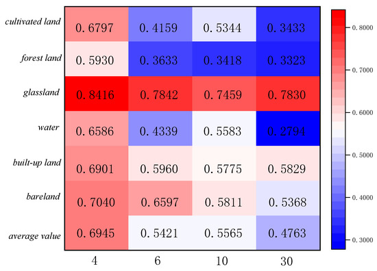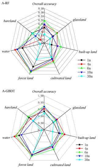 The comprehensive analysis of the classification results of the five different spatial resolution images shows that higher spatial resolution of the images allows for better extraction features with smaller areas or sizes. For instance, small features such as reservoir pits are difficult to be extracted on images of 10 m and 30 m resolution but can be extracted on high-resolution images such as 1m and 4 m images of GF-2. Cultivated land is extracted more completely and clearly outlined on mesoscale 6 m and 10 m images, while the area of cultivated land extracted on 30 m upper images is large. The classification results are better for the small-scale resolution of feature types with larger areas and single features; for instance, grassland is better classified on 10 m and 30 m images with less pepper and better consistency.