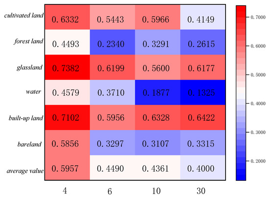 From the analysis of classification accuracy after resampling, the overall classification accuracy of real images with different resolutions and the f1-score of each category after resampling in study Region A and Region B are shown in Figure 10. From the figure, it can be seen that the overall classification accuracy and consistency between each category are not very good. The consistency in study Region B is better than that in study Region A. The greater the regional heterogeneity, the greater the effect on the images after resampling. Combining the analysis of Region A and Region B, the consistency was higher on urban and rural industrial and mining residential construction land and forest land, and the uncertainty was larger in other categories, which is basically similar to the findings of Xu et al. [47]. It further indicates that resampling increases the uncertainty of the classification.
