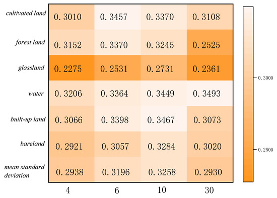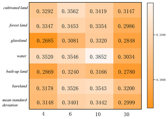 In the two study areas, the proportions of cropland, grassland, urban and rural industrial and mining residential construction land, and bare land are larger, and their consistency of classification results on SPOT-6, Sentinel-2, and Landsat-8 images is higher. There is less uncertainty in the attribution of image categories for these four features. The mean value of water is lower because the areas under water are smaller and distributed in strips, corresponding to a smaller scale. The mean value of GF-2 (4 m) is the largest in both study areas, 0.5957 and 0.6945, indicating 40% uncertainty in Region A and 30% uncertainty in Region B. The mean standard deviation is around 0.3, indicating fewer fluctuations and more reliable mean decomposition.