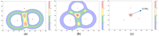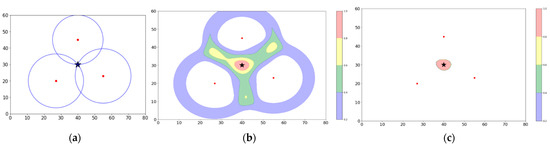 (a) Triangulation of a single PR using circles determined from RSS. Red dots are AP positions. The solution is indicated by the black star. (b) Equivalent method using the sum of probability “bowls” (see text) to localize the PR. The black star coincides with the high-probability zone in red. (c) Reincorporation of all probabilities into the red “decision zone”.