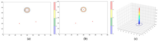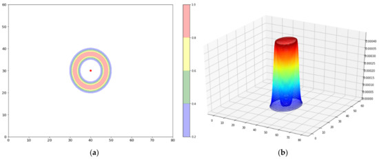 An equivalent but somewhat more realistic simulation is shown in Figure 1b. In this case, the anticipated uncertainty in measured RSS values is taken into account, which is conventionally taken to have a Gaussian distribution with a variance of 2 dB. In this case, given an RSS, a PR produces a spatial probability density distribution in the form of a “bowl” whose radius is calculated using Friis and whose “lip thickness” is dictated by the 2 dB RSS uncertainty, translated, again through Friis, into a physical distance. The formula for the bowl is then given by