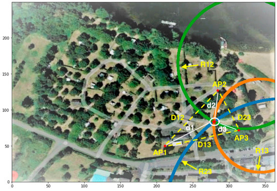 One way to reduce the dependence on propagation parameters is to make use of a simple observation arising from the Friis equation. Consider three APs, AP1, AP2, and AP3, arranged in a triangle as shown in Figure 5, for an example from Site 2. The distances between the APs are D12, D13, and D23. A client located at some position in the vicinity of this triangle—in this case, within it—emits a PR that is received simultaneously at the three APs, with power values RSS1, RSS2, and RSS3. Inverting Equation (1) and taking d1, d2, and d3 as the distances of the client from the three APs gives: