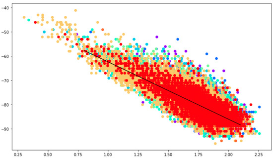 The importance of the Apollonius localization solution, apart from being independent of the parameter A, is that the position found also depends only weakly upon the fading exponent n for the range 2 < n < 3. A simple calculation shows that for n in this range, the radius of an Apollonius circle varies by only about 16% of the distance Dij between two APs, which in turn is of the same order as the intrinsic resolution obtainable in outdoor WiFi networks. This relative independence of Apollonius client positions on propagation parameters allows us to envisage using them to calibrate A and n, which is a very interesting proposition in the not uncommon real-world situations where propagation ground truth is not available. Figure 6 shows a plot of RSS versus log-distance for the Site 1 dataset, using as distances Apollonius solutions deemed to be of good quality. The resulting distribution is well described by the Friis formula, with A = 36.2 dBm and n = 2.24. These values are then used to calibrate the Friis formula for the site in question.