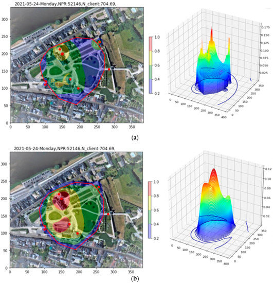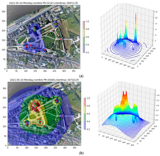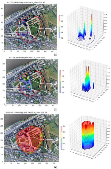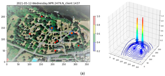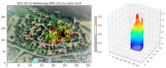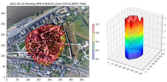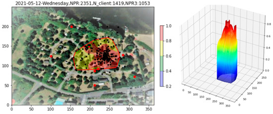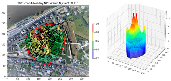 In the 2D plot, two red high-occupancy zones are visible. The estimate for the lower one, which is consistent with the site entry ticketing area, is 68 clients on a surface area of 1990 m2. The upper one, corresponding to one of the major tourist attractions of the site, is estimated to contain 48 clients in an area of 1482 m2, while the surrounding yellow zone contains 245 clients in an area of 8954 m2. The total integrated number of clients in all regions of the plot is estimated at 704.