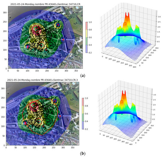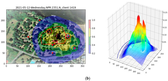 The raw PR density over the three-hour afternoon period from 12:00 to 15:00 is shown in Figure 7, both in 2D and 3D. From the 3D plot, it is clear that sharp peaks caused by clients within a few meters of an AP obscure the finer-scale data. So pronounced is the effect that the 2D plot appears almost empty. To alleviate this problem, the integrated PR count from indoor APs, as well as all PRs with RSS > −60 dBm, is recorded, and then these PRs are removed from the plot (Filtering step). The density after filtering appears in Figure 7b), where the underlying structure of the density over the full site begins to become apparent.