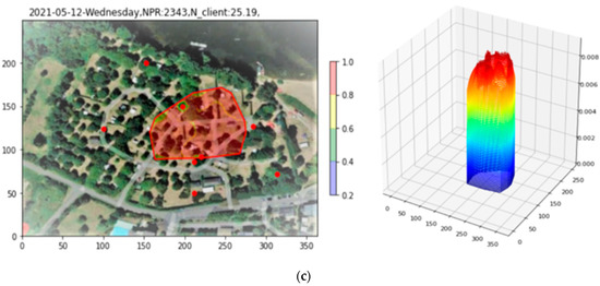 In Figure 3, a new example illustrating some of the difficulties encountered in real-world outdoor WiFi networks is introduced. Consider a cluster of 11 clients with positions randomly distributed over some small region within the triangle formed by the APs. An experiment is performed over a time window in which an average client device would emit a single PR. Implicitly, this refers here to a mean PR emission probability, say X, averaged over all types of devices and client activities, that is, X = 1 for the toy model for the chosen time window. The use of such an X is a core concept of the technique, to which we will refer frequently. For this example, suppose that, due to propagation effects, the average probability of a given AP receiving a client-emitted PR at this distance is about 1 in 3, such that single AP receptions will dominate the experiment, but occasionally two or three APs could be involved. Furthermore, let us suppose that as this time window evolves, five clients each emit a PR that is received only at the leftmost AP, and five others emit a PR that is received only at the rightmost AP. By superimposing the bowls corresponding to these 10 PRs, one obtains the distribution in Figure 3a.