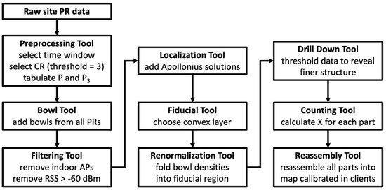 As we have seen, the “Bowl,” Filtering, and Drilldown tools are graphical techniques used to make the spatial representation of client density clearer. The Reconstruction tool, in turn, in concert with the others, is a bookkeeping tool that allows one to retrieve the different pieces into which the problem has been divided and reconstruct them into a coherent and easily interpretable whole. It is the Fiducial tool, making best use of the limited localization information available in low-resource networks; the Localization tool, calibrated in a bootstrap procedure; the multi-step Counting tool allowing time and space domain adaptation of the X proportionality factor; and the Renormalization tools for redepositing the PR probabilities within the deduced fiducial region, that embody most of the originality and warrant the success of the approach presented.
