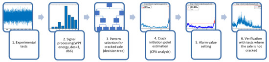 The use of the WPT approach due to its filtering capability facilitates the study of patterns and its association with theoretical fault frequencies. Furthermore, it allows us to be sure that energy increases are due to cracking and not to other effects. It is also very useful for the study of the optimal patterns for crack detection in the proposed methodology, promoting an early diagnosis. On the other hand, the establishment of an automatic adaptive alarm value allows generalisation, as it is based on the mean and standard deviation of the machine’s data, allowing it to adapt to different models and operating conditions, as well as dealing with the problem of condition monitoring in non-stationary conditions. This would solve a problem already reported in previous work where supervised learning classification systems were used. The validation of the methodology was performed on the basis of vibration signals obtained during fatigue tests of real full-scale railway axles where fatigue cracks were naturally occurring, which is also valuable. In addition, various vibration directions were measured, and we concluded that indications of cracking occurrence were mainly in the longitudinal direction of the vibration (parallel to the track).