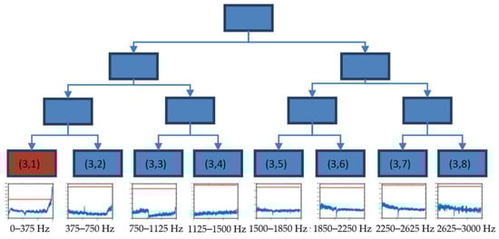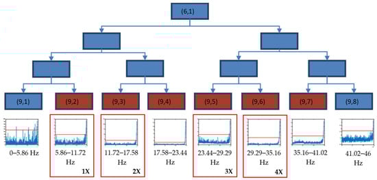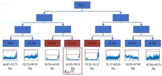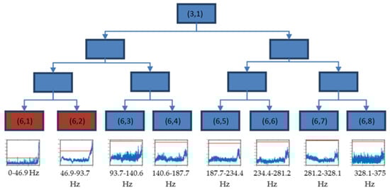 It is intended that the selected patterns or packets cover a band of frequencies narrow enough to identify the frequency to which it is related and also that it is not affected by events other than the defect. For this purpose, a decomposition level k = 9 ( packets, ) was chosen. To automate the selection of patterns among the 512 possible, a decision tree was established, starting at decomposition level k = 3, where packets exceeding a threshold value in the final test area were chosen to be decomposed up to decomposition level k = 6 (, ). Again, in this phase, those packets that exceed the threshold value established as a decision criterion at level 6 will be decomposed up to level 9.
