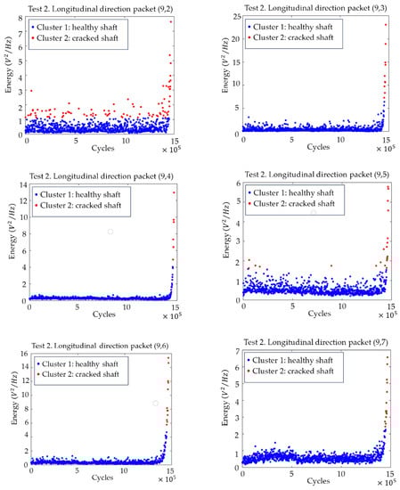 - Pattern selection. When there is evidence that the axle is cracked during the test, an analysis of the evolution of the energy with the number of cycles by frequency bands or packages is carried out. The aim is to find the packages whose energy value is sensitive to the appearance of the defect. Those packages that show a change of trend or change point in the energy levels that allow the crack initiation to be detected are chosen as possible defect indicators.