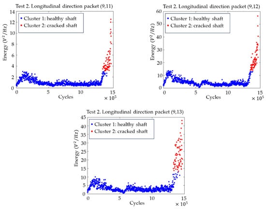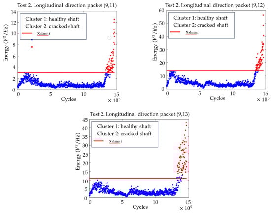 Time evolution of the energies for the packages from (9,11) to (9,13) related to the subharmonics of the natural frequencies of the axis, with the division into two clusters (cracked–uncracked) and with the adjusted final alarm value in the longitudinal direction for test 2.