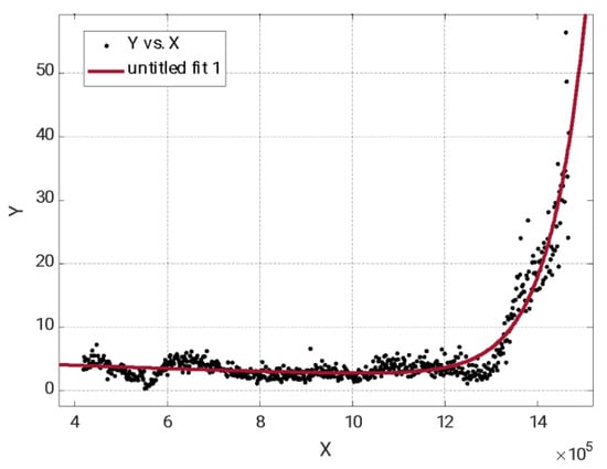 To validate the selected alarm value, the probability that the data corresponding to a safe area will exceed the threshold value, corresponding to data where the crack has not started, was studied. To perform this calculation, it was assumed that the population of data with respect to the number of cycles was adjusted with an R-square of 0.9 to an exponential function, according to Figure 13.
