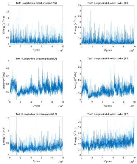 In the final step, the parameters chosen as crack indicators for test 2 were used to analyse data from test 1, in which the axle was not cracked. Figure 15 shows the evolution of the packet energy related to the harmonics of the rotational speed, from (9,2) to (9,7). It can be concluded that the trend of the energies was stationary in mean and variance throughout the test, and the effects observed in the case where the crack appeared were not observed.