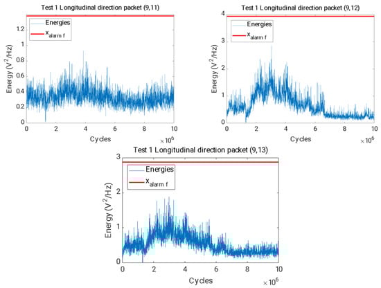 Time evolution of the energies for the packages (9,11), (9,12) and (9,13) and final alarm value in red in the longitudinal direction for the test.