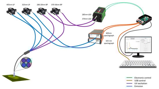 The fluorescence measurements were performed with the commercially available LS55 Luminescence spectrometer equipped with a fiber optic accessory (Perkin Elmer, Waltham, MA, USA). Meanwhile, the portable fluorimeter was in-house built within the Biomedical Engineering and Physics Departments of the Amsterdam UMC, University of Amsterdam (Figure 1). The portable fluorimeter equipped with a handheld fiber consists of two light-emitting diodes (LEDs) emitting at 285 and 370 nm (Avalight-HPLED, Avantes, Apeldoorn, The Netherlands) and two bandpass filters at 280 nm and 370 nm, with a 20 nm and 36 nm bandpass, respectively. To measure the protein and FOX emissions, the portable fluorimeter consists of two fiber spectrographs (Avantes AvaSpec-ULS2048CL-EVO and AvaSpec-ULS2048-USB2-VA-50, Avantes, Apeldoorn, The Netherlands) with longpass filters to record emissions between 325 and 1100 nm and 405 and 1100 nm, respectively. Furthermore, to control the LEDs and spectrographs for data collection, a Raspberry Pi 3B with a mouse, keyboard, and monitor was used in combination with custom acquisition software written in Python.