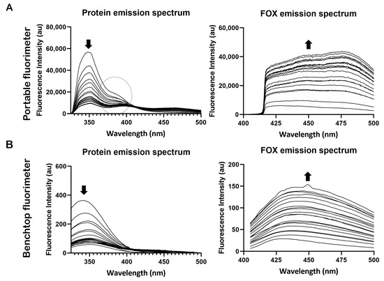 With both fluorimeters, the decrease in protein fluorescence and the increase in FOX fluorescence over time could be monitored. However, spectral differences were observed between the emission spectra of the two fluorimeters. With the portable fluorimeter, two peaks can be distinguished in the protein spectrum in the wavelength ranges of 325–375 nm and 375–425 nm, see Figure 2A. The peak between 375 and 425 nm was not observed when measuring with the benchtop fluorimeter (Figure 2B). To allow comparison between the two fluorimeters, only the peak in the wavelength range of 325–375 was used. For the FOX spectrum, the spectral shape also differs when measured with both fluorimeters; however, no clear peaks could be distinguished, see Figure 2.