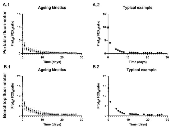 The ageing kinetics of semen stains measured with the portable and benchtop fluorimeters are presented in Figure 3. Similar decay kinetics were observed, despite the differences in their fluorescence spectra. Over time, the Proteinfl/FOXfl ratios decreases until no dynamics in the reaction kinetics can be observed. Note that little variation was observed within the triplicate measurements (Figure 3A.2,B.2).