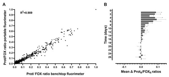 To allow the comparison of Proteinfl/FOXfl ratios over time, these were normalized by scaling the lowest ratio to 0 and the highest to 1 with each time series. The normalized Proteinfl/FOXfl ratios of each sample measured by the portable fluorimeter were plotted against the normalized Proteinfl/FOXfl ratios that were measured with the benchtop fluorimeter, see Figure 4. A Pearson rho test showed a strong correlation between the Proteinfl/FOXfl ratios measured with the portable and benchtop fluorimeters (Pearson correlation coefficient = 0.99, p = 0.000). The average differences of the mean Proteinfl/FOXfl ratios between the two fluorimeters per time point are shown in Figure 4B. The Proteinfl/FOXfl ratios of the benchtop fluorimeter were at a maximum (t = 5 days) 9% higher than those measured by the portable fluorimeter.