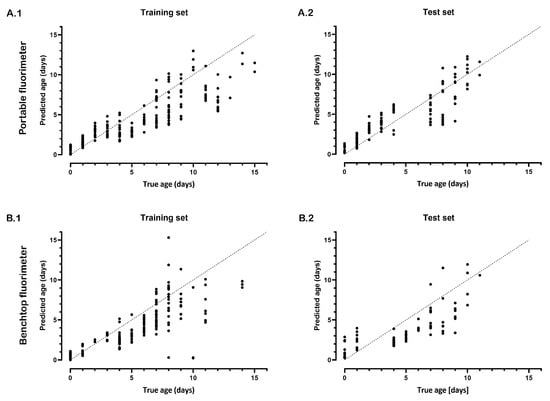 Age estimation of semen stains measured with the portable and benchtop fluorimeters: age estimation with the portable (A.1,A.2) and benchtop (B.1,B.2) fluorimeters using a training (A.1,B.1) and test set (A.2,B.2). The dots represent the average age estimation of the four different ƒ0 values of each semen stain for each time point.