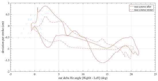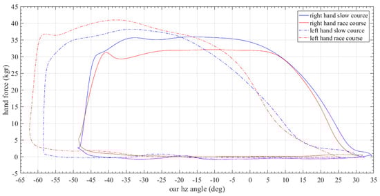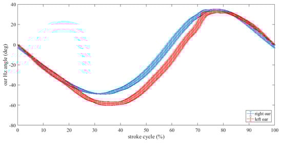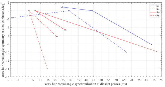 - Symmetry of the horizontal and vertical angles for each oar at the moment of application of the maximum force during the stroke cycle (deg versus deg): indicates symmetry for the positions of the oars at the moment of application of the maximum force on the strokes.