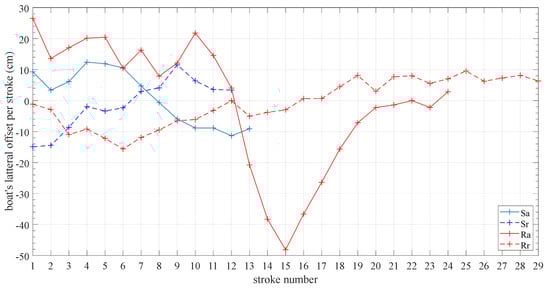 - Third error in rowing technique—Slow, steady rowing rate (20 spm) throughout the course with incorrect technique in the “catch” phase until just before the “recovery”, where the athlete does not apply maximum force to the oars with the required angular velocity.