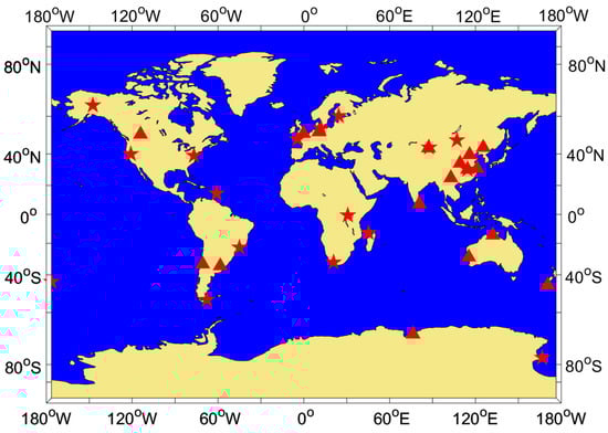 Distribution of experimental stations (Pentagram: MGEX station, triangle: IGMAS station).