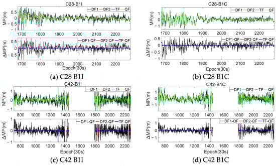 In order to compare the differences in the extracted MP sequences when different frequency combinations were used, taking the B1I and B1C frequencies as examples, four modes with varying combination noise from dual-frequency to quad-frequency were selected to extract the MPs for each frequency. The specific combination frequencies and coefficients are shown in Table 2. Although there were differences in the combined noise of the four modes, each mode listed was the optimal combination coefficient calculated for the corresponding frequency. This section mainly verifies the difference between the different frequency combinations on the obtained MP sequences, without considering the difference between the optimal combination and non-optimal combination among each frequency. In fact, the experimental results can still reflect the difference between them, as the combination noise of the non-optimal combinations also increased correspondingly, and the comparison results should be similar to the results.