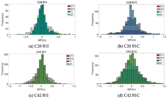 By comparing the four modes, it can be observed that the MP sequences extracted using the triple-frequency and quad-frequency combinations exhibited a similar trend to those extracted using the traditional dual-frequency method, but with smaller fluctuations. This indicates that the coefficient calculated using Equation (11) was correct and optimal. The results also show that if the was small, the fluctuation of the extracted MP sequence was smaller. By comparing this with the QF mode, it can be observed that, when the difference of the was relatively small, the first-order difference between the two sequences generally fluctuated within 3 cm. However, the difference between the QF mode and the DF1 mode still fluctuated at the meter level. This indicates that, when the was small, the extracted sequences were essentially consistent with each other. Additionally, Table 3 also shows that the improvement in the accuracy, relative to the DF1 mode, was consistent across the different combination modes. Therefore, when certain frequency observations were missing, other combination modes could be adaptively selected to extract the MP. Figure 4 presents histograms of the frequency distributions for the MP sequences extracted using different modes. It can be seen that the sequences from the DF2, TF, and QF modes are relatively more concentrated around zero. However, due to the favorable observation environment at the KUN1 station, the representation in the histograms of the frequency distribution is not significant.