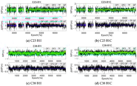 In this section, the analysis of the MP difference sequences under the different modes was also conducted using the dynamic observations from Section 3.1. Figure 9 and Figure 10 provide the MP difference sequences extracted with the consideration of I1,2 for various frequencies of the C23 and C38 satellites at the CAR1 station. Table 7 presents the accuracy statistical information of all the MEO and IGSO satellites at the CAR1 station using different modes.