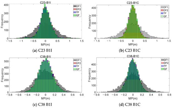 To further validate the theories proposed in this article and compare the characteristics of the MP sequences extracted from the different modes, the same frequency combinations and coefficients shown in Table 2 were used to process the dynamic observations. Similar to Figure 3, Figure 5 presents the results and difference sequences for satellites C23 and C38, while Figure 6 displays histograms of the frequency distribution for the MP sequences extracted using the different modes. Table 4 provides the accuracy statistics for the two satellites.