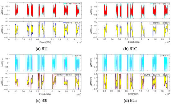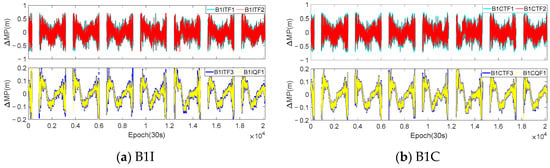 In Section 3.1, the influence of the four different frequency combination modes on the MP extraction was compared using the B1I and B1C frequencies as examples. However, the coefficients used were the optimal solutions only when I1,1 was eliminated, and the influence of the simultaneous elimination of I1,2 on the extracted MPs was not considered. From the derivation process of the optimal coefficients in Section 2, it can be found that, when only I1,1 was considered, the dual-frequency combination could only have a unique solution, while the triple-frequency, quad-frequency, and five-frequency combinations could obtain the optimal solution with the minimum combination noise due to the presence of redundant observations. Similarly, when considering both I1,1 and I1,2, Equations (4) and (5) need at least three frequency observations to achieve a unique solution, and the quad-frequency and five-frequency combinations could obtain the optimal solution. Based on the findings in Section 3.1, when the combination noise was similar, the extracted MP sequences were also very similar. In this section, a further analysis is conducted to examine the impact of ionospheric delay on these MP sequences. Taking the triple-frequency and quad-frequency combinations as examples, the influence of second-order ionospheric delay on the MP sequences extracted using different frequency combinations is analyzed. Table 5 provides the selected combination modes and their corresponding coefficients for the B1C, B3I, and B2a frequencies. The combination modes for the B1I frequency can be found in Table 1, where B1I/B1C/B3I, B1I/B1C/B2a, B1I/B3I/B2a, and B1I/B1C/B3I/B2a are represented as B1ITF1, B1ITF2, B1ITF3, and B1IQF1, respectively.