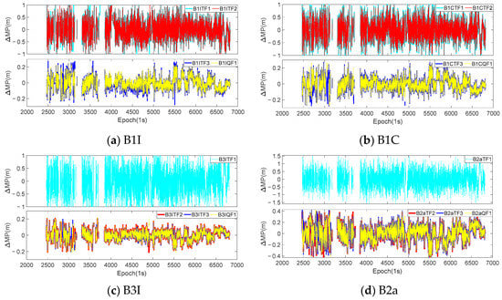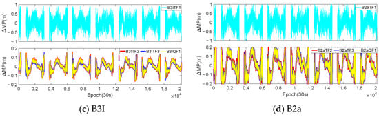 (2) According to reference [,], when only I1,1 is considered, the anti-multipath performance of the B2a frequency is better than that of other BDS-3 frequencies. However, the experiments showed that, when eliminating I1,2 simultaneously, the MPs of the B2a frequency extracted using different modes exhibited larger fluctuations. Table 6 also indicates that, except for modes such as B2aTF1 with significant noise, the STDs for the other three modes were approximately 2–3 times larger than those for the other frequency modes. From the statistical results, it can be seen that the averages of the STDs and ranges of the B2aTF2, B2aTF3, and B2aQF1 modes were 0.113 m and 0.726 m, respectively, which were about 1.8, 1.7, and 2.2 times and 1.6, 1.7, and 1.9 times greater than those of the B1I, B1C, and B3I frequency combinations. The anti-multipath performance of the B3I frequency was also relatively superior, and the combination with a smaller corresponded to a lower STD and range compared to those of the other frequencies. This characteristic was contrary to that of the B2a frequency, and further research is needed in the future.