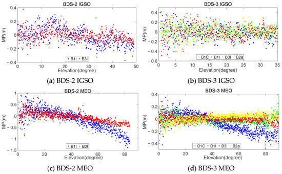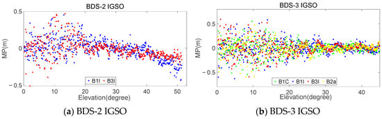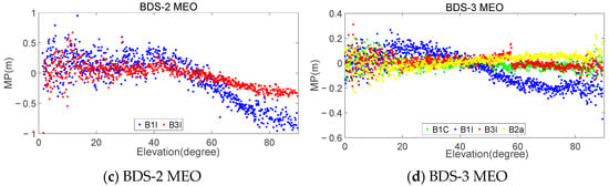 The analysis of the statistical results for all the stations in Figure 2 reveals that the MPs of the MEO and IGSO satellites of BDS-3 exhibited similar systematic biases related to elevation, similar to BDS-2 satellites. Both of them showed more significant changes in MEO satellite systematic biases with elevation. The correlation strength between the MP and elevation varied significantly among different types of satellites and frequencies. The anti-multipath performance of BDS-3 at various frequencies was better than that of BDS-2. The MP of BDS-3 fluctuated around −0.5 m-0.5 m, while BDS-2 mainly fluctuated around −1.0 m-1.0 m. Comparing the different frequencies, it can be seen that the MP fluctuation amplitude of the B2a and B3I frequencies was smaller, while that of the B1C and B1I frequencies was larger. Additionally, the magnitude of the MP fluctuations varied across different satellite orbits for the same frequency. Overall, for BDS-3 satellites, the MP magnitude of the MEO and IGSO satellites was roughly equivalent, while for BDS-2 satellites, the magnitude of the MEO satellites was greater than that of the IGSO.