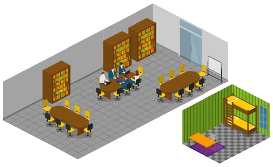 The experiment is based on the exposure of the sensors to indoor environments where the air is expected to have random and non-steady concentrations of carbon dioxide over time. The places chosen for sensor placement were an office room and a dormitory bedroom (Figure 2). The office room has an active ventilation system, measures about 235 m3 (12 × 6.5 × 3 m), and is a shared place for researchers in a university, so its occupation varies during the daytime. The bedroom has no active ventilation system (only windows), measures about 30 m3 (4 × 3 × 2.5 m), and is occupied by two people during night-time.