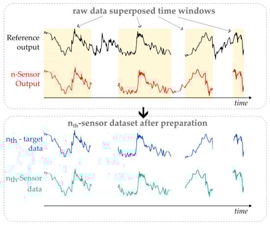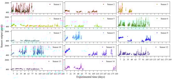 In the dataset resulting from the outdoor exposure experiment, the outputs from the fourteen carbon dioxide sensors were already synchronized with the reference outputs. However, intermittency in data continuity for all sensors was observed and, for this reason, it was necessary to apply an intersection between the reference station data and each sensor’s data to ensure that the machine learning model would receive only valid readings either in its input or target data. Moreover, a new feature was created in the sensors’ timestamps dataset. This new information contains the total exposure time of each sensor in days fractions. Its goal is to verify if the algorithm can identify and compensate for the ageing drift of the sensors, considering that the reference was being periodically recalibrated and, thus, was not influenced by ageing.