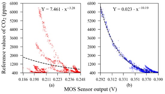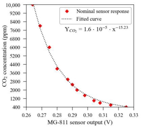 Therefore, whether as a situation diagnosis or as a continuous observation tool, the monitoring of carbon dioxide indoors is relevant mainly because of the impacts that the gas can cause on the performance and productivity of workers or students when in higher concentrations. High-accuracy measuring instruments serve this purpose satisfactorily but are expensive. This impedes their acquisition, especially in developing countries, public schools, or large facilities. This creates an opportunity to apply low-cost carbon dioxide sensors, even though further treatment may be required to improve the accuracy of their readings. This is especially so for metal oxide semiconductor sensors (MOS), which are dependent on environmental conditions [] and whose information extraction process from the nominal response curve provided by the manufacturer is non-trivial or subject to large inaccuracy [].