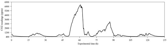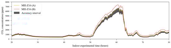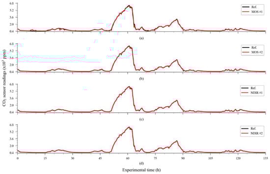 The field experiment carried out by Zimmermann et al. [] used, for carbon dioxide monitoring, the sensor SST-CO2A, an NDIR device whose nominal accuracy parameters are ±30 ppm + 3% of the reading, for the version with a measurement scale of 2000 ppm. In terms of the transduction principle, this sensor model uses the same technology as the MH-Z16A evaluated in the indoor experiment.