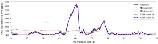 Low-cost widely available sensors, provided that they present satisfactory accuracy, can also play an important role in indoor air quality assessment. Although carbon dioxide is not considered a toxic gas, in higher concentrations, it has some side effects in humans. In the outdoor environment, CO2 concentration levels are globally assessed due to their relationship with the greenhouse effect, wildfires, and fuel burning. When indoors, the approach is different because the main sources of carbon dioxide in this environment are the occupants, and occupied rooms without proper ventilation tend to accumulate CO2 over time. Considering that the quantity of CO2 in each indoor space can be proportional to the number of occupants, studies are using gas concentration levels to estimate room occupancy [,,]. Moreover, CO2 levels are a good indicator of air quality and ventilation system performance. The main concern is that higher carbon dioxide concentration levels may cause undesirable effects in occupants, which can include dizziness, lack of initiative, headache, and other cognitive impairments [,,,]. There are even more worrying scenarios, for example, in primary schools with poor (or inexistent) ventilation systems. Increased concentration levels of carbon dioxide in classrooms may affect children’s concentration and learning [].